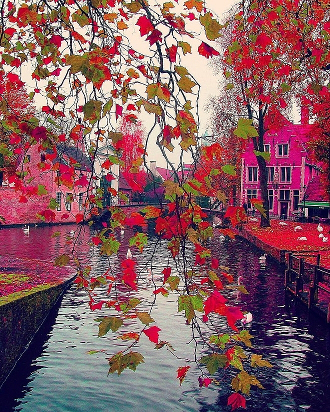 Những bức ảnh về vẻ đẹp của Bruges (Bỉ) vào mùa thu thơ mộng đến lạ với sắc vàng, hồng và đỏ. Cây cối ở đây trông như được chiếu sáng từ bên trong và phát ra sắc màu rực rỡ, nhuộm cả không gian. Các tuyến đường thủy chạy qua đường phố đóng vai trò như tấm gương phản chiếu, khiến du khách cảm tưởng như chìm trong giấc mơ siêu thực. (Ảnh: Pinterest, Colours of Nature)