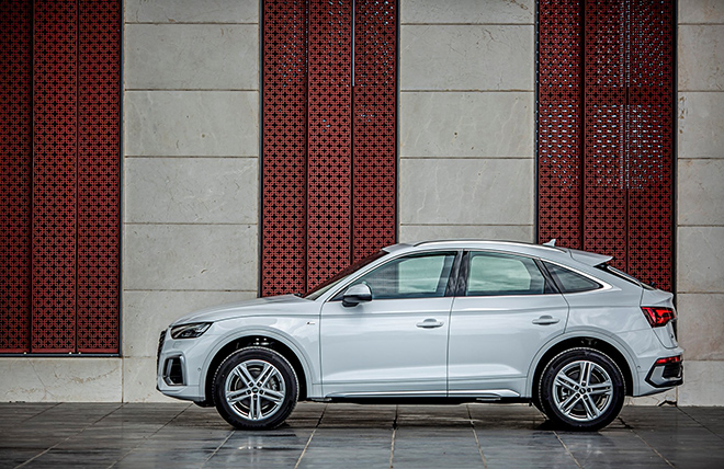 Hai bên thân xe Audi Q5 Sportback vẫn là những đường kẻ dọc lịch lãm, chạy dọc theo vòm bánh và trải dài qua các cánh cửa, nhấn mạnh tính ổn định và mạnh mẽ của một chiếc CUV. Ngoài ra, thân xe thể thao hơn với bộ la-zăng hợp kim thiết kế 5 chấu kép hình ngôi sao, đường kính 19 inch đi kèm với bộ lốp 235/55 R19.