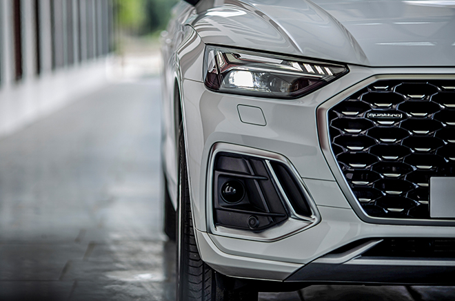 Đầu tiên là cụm lưới tản nhiệt khung đơn bát giác, kết hợp với hai hốc gió lớn ở hai bên. Theo sau là cụm đèn pha LED matrix tích hợp dải đèn chiếu sáng ban ngày nổi bật. Cụm đèn pha tiêu chuẩn của Audi Q5 Sportback còn tích hợp công nghệ đèn chiếu xa tự động, đèn chiếu sáng ban ngày riêng biệt, đèn xi nhan năng động và hệ thống rửa đèn pha.
