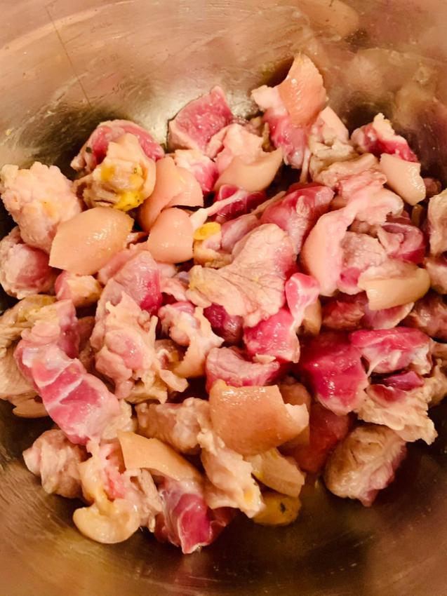 Sau khi luộc chần thì rửa sạch và cắt miếng vừa ăn (thông thường thì thịt kho đông sẽ thái miếng hơi vuông và dầy chứ không thái mỏng dẹt như thịt xào).