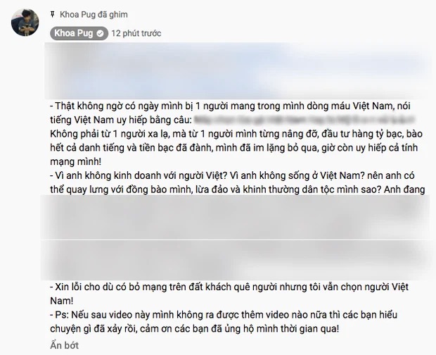 Ngay trong chính video mới nhất, Khoa Pug cũng đã đưa ra thông điệp cầu cứu, từ trong nội dung video cho đến ảnh đại diện.