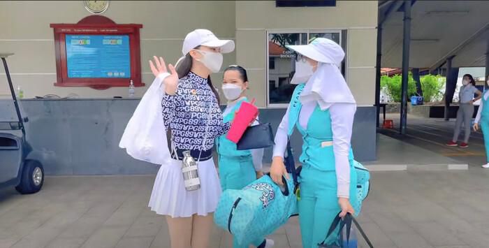 Trước khi vào sân golf thì cô phải đưa giấy kiểm tra đã tiêm 2 mũi vaccine: "Hôm nay Giang chọn sân Thủ Đức vì sân này rất gần nhà Hương Giang luôn. Có rất nhiều xe, chắc là hôm nay cũng đông đó mọi người ạ".