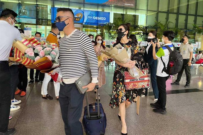 Dù che kín mặt thế nhưng phong cách ăn mặc sang chảnh đủ giúp Jennifer Phạm tỏa ra sức hút ấn tượng giữa sân bay đông người qua lại.