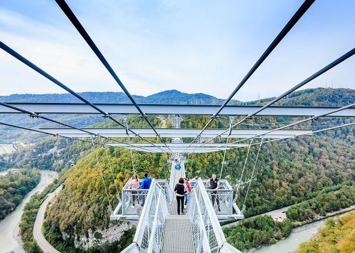 Cây cầu treo SkyBridge bắc qua thung lũng Krasnaya Polyana, tây nam nước Nga. Với chiều dài 1km, đây được xem là cầu treo đi bộ dài nhất thế giới. Cây cầu được mở tại Sochi chỉ bốn tháng sau khi trao huy chương vàng cuối cùng tại Thế vận hội mùa đông 2014. Cầu SkyBridge có sức chứa lên tới 30.000 người trong cùng một thời điểm. Du khách có thể dừng chân ngắm cảnh thiên nhiên tại các trạm nghỉ trên cầu hay nhảy Bungee.