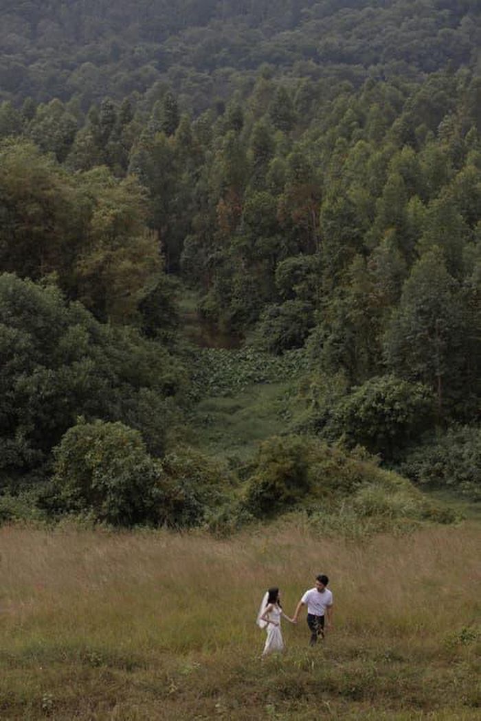 Không diện váy cưới bồng xòe, cồng kềnh, con gái Xuân Hinh mặc trang phục đơn giản, tiện di chuyển khi chụp hình ngoại cảnh. Bởi cả hai đều muốn ảnh cưới của mình như một cuộc dạo chơi, ưu tiên cảm xúc tự nhiên nhất.