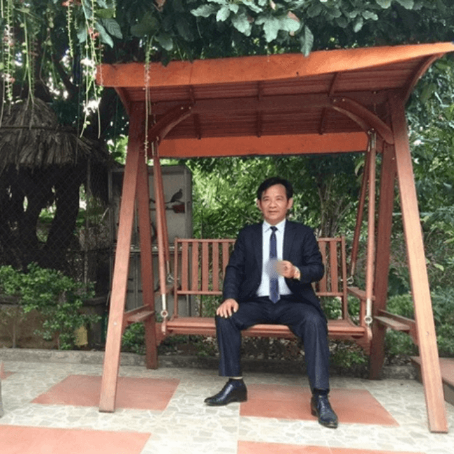 Khoảng sân rộng được trang trí bằng gạch men màu đỏ - ghi, xung quanh trồng nhiều loại cây cảnh. Ở góc sân, anh đặt một bộ bàn ghế đá để uống trà và một chiếc xích đu. Góc này được phủ rợp bởi cây cối.