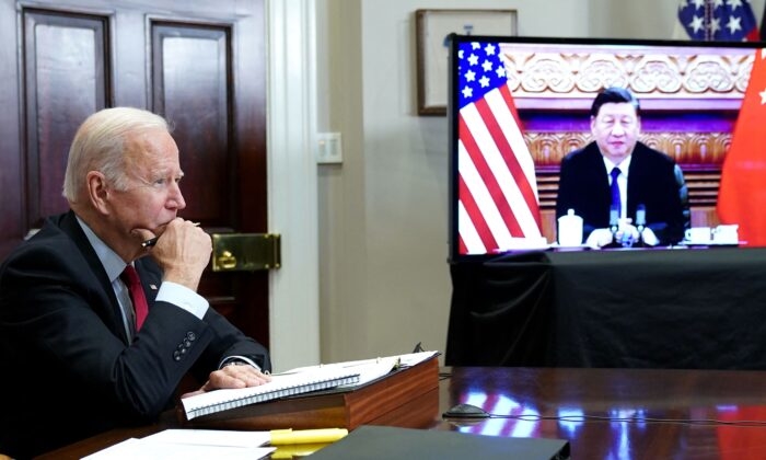 Tổng thống Hoa Kỳ Joe Biden nói chuyện với nhà lãnh đạo Trung Quốc Tập Cận Bình trong một hội nghị thượng đỉnh trực tuyến từ Phòng Roosevelt của Tòa Bạch Ốc, hôm 15/11/2021. (Ảnh: Mandel Ngan / AFP qua Getty Images)