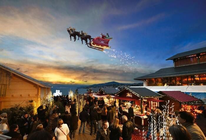 Cỗ xe ông già Noel bay trên trời là hoạt động hút khách đến hội chợ Giáng sinh bên hồ Geneva.