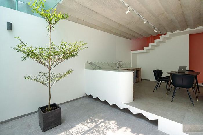Chức năng sử dụng ở tầng trệt được bố trí tối thiểu, lùi về sau để nhường diện tích cho khoản sân nhỏ.