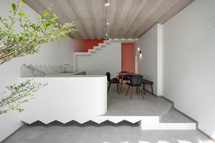 Để đáp ứng nhu cầu mở một hàng ăn nhỏ tương lai, chức năng sử dụng tầng trệt của ngôi nhà ống này được bố trí một cách tối thiểu.