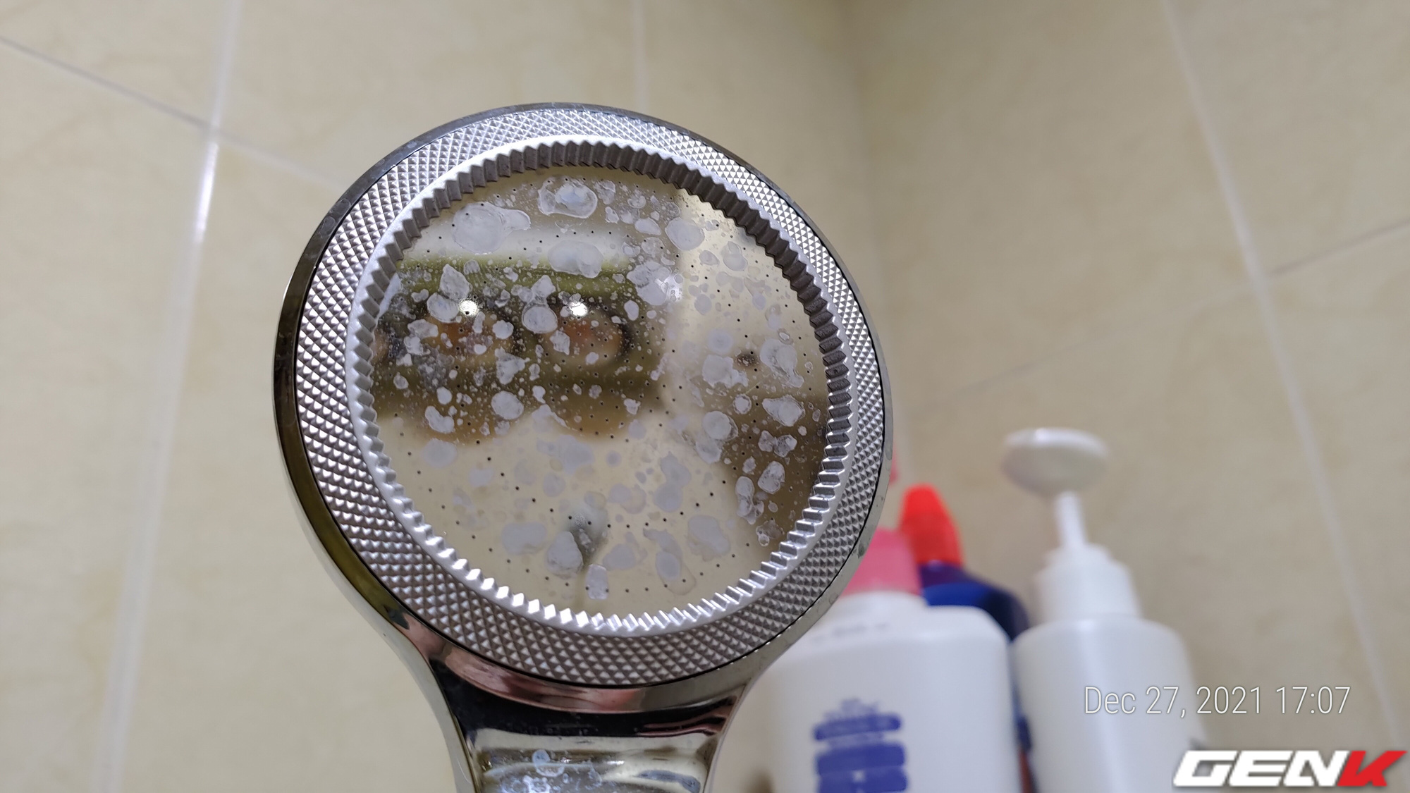 Để làm sạch mặt phun của ṿi hoa sen bị bẩn không hề khó. Bạn chỉ cần tháo tấm mặt phun nhôm và đem ngâm trong nước cốt chanh (hoặc giấm) qua đêm để cặn khoáng (chủ yếu là canxi) bị ḥa tan và làm mềm bớt, rồi dùng bàn chải cọ sạch lại vào sáng hôm sau.