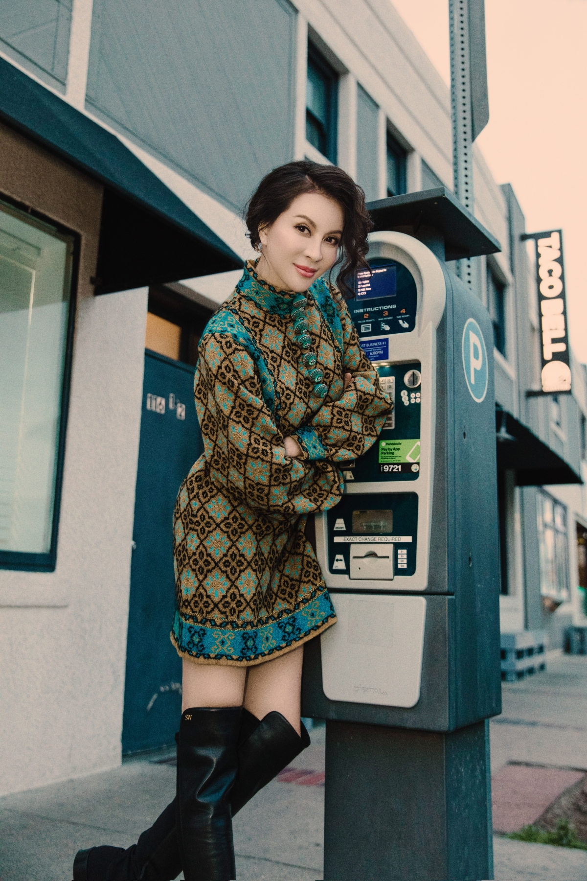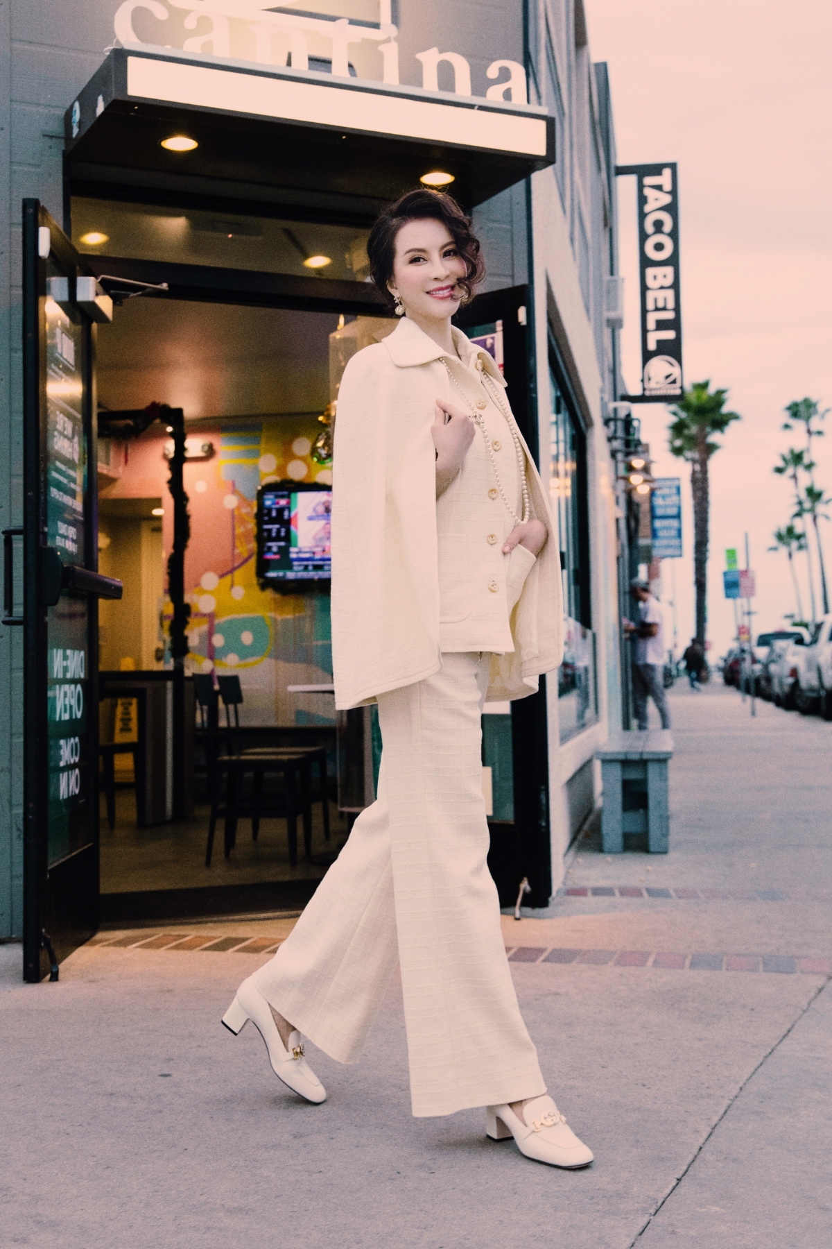Tại bờ biển Huntington của bang California, diễn viên "Tình khúc Bạch dương" chọn trang phục thanh lịch, theo phong cách nữ doanh nhân.