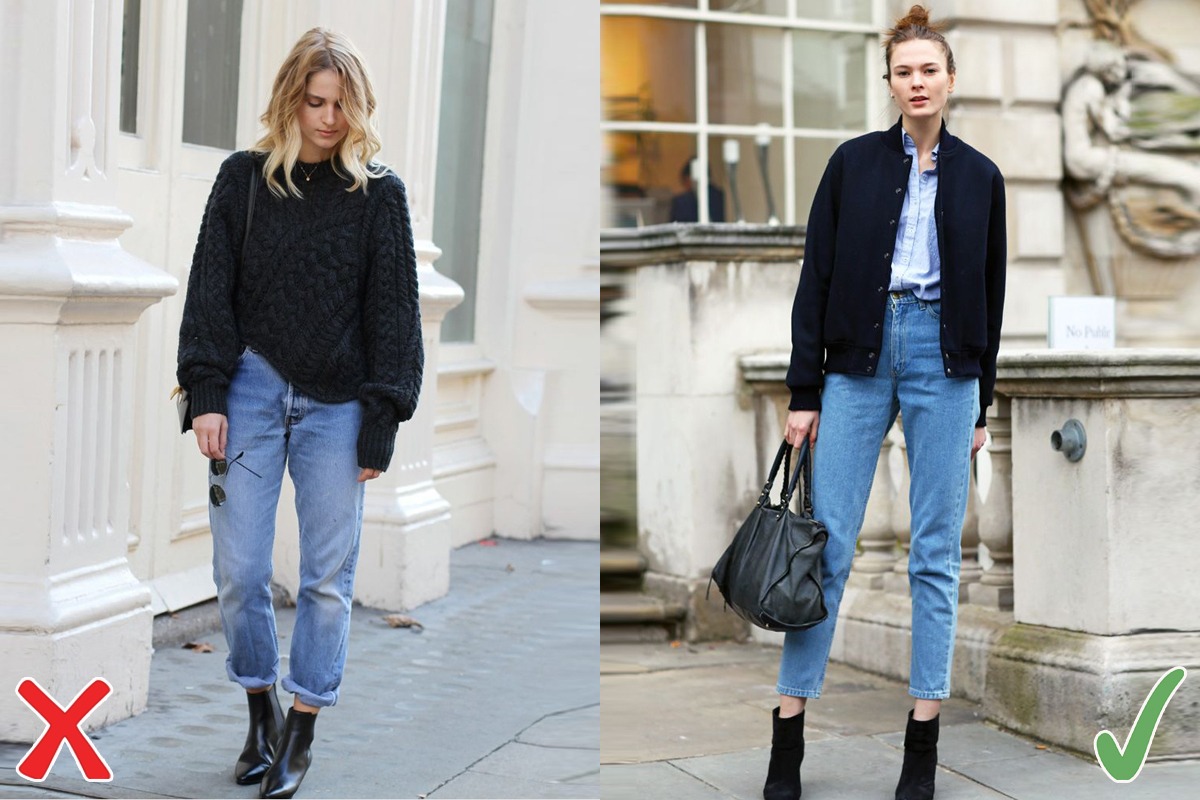 Dáng quần phồng hông, ôm dần về phía ống đã thuộc về quá khứ vì khiến thân dưới của người mặc trông đồ sộ hơn, eo và chân càng đầy đặn. Thay vào đó, một chiếc quần dáng mom jeans với cạp cao, hông phồng vừa phải và dáng đứng sẽ giúp thân hình thêm quyến rũ, cân đối.