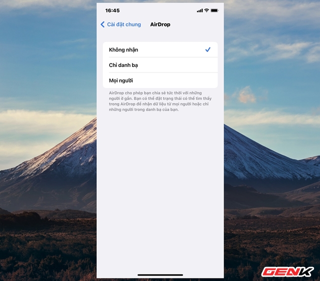 AirDrop sẽ cung cấp cho bạn 03 lựa chọn để sử dụng, bao gồm "Không nhận" (tức là tắt tính năng này để ngăn không cho bất kỳ ai chia sẻ bất cứ thứ gì với bạn qua AirDrop), "Chỉ danh bạ" (tùy chọn này sẽ giới hạn việc chia sẻ với những người có địa chỉ email hoặc số điện thoại trong danh bạ của bạn) và "Mọi người" (tùy chọn này sẽ giúp bất kỳ ai cũng có thẻ chia sẻ qua AirDrop với bạn).