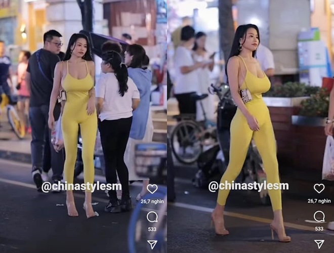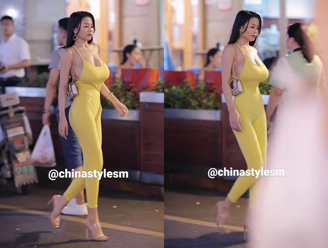 Mới đây, tài khoản mạng xã hội chuyên cập nhật về phong cách thời trang đường phố Trung Quốc có đăng tải một video thu hút sự chú ý. Người đẹp này diện thiết kế bodysuit màu vàng dáng hai dây tôn vòng 1.