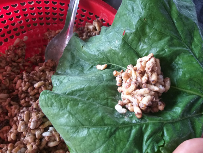 Nhộng ong sau khi để ráo nước được cho vào lá bầu, gói lại