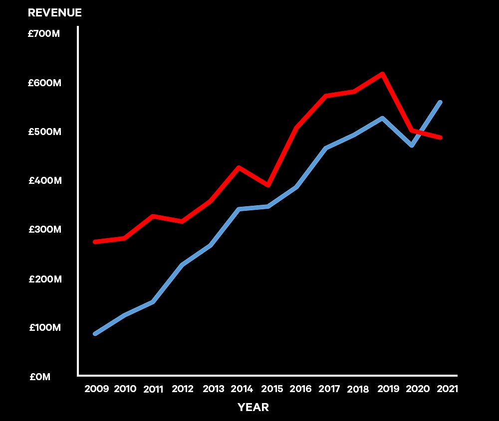 Biến động doanh thu giữa Man City (xanh) và Man Utd (đỏ) giai đoạn 2009-2021. Đơn vị: triệu bảng. Tỷ giá: 1 bảng = 1,37 USD. Ảnh: Athletic