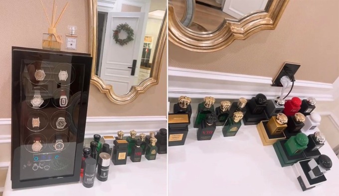 Sau khi dọn về biệt thự mới, Lệ Quyên đang dần hoàn thiện từng góc trong không gian sống. Cô dành một góc trong phòng thay đồ để trưng bày loạt đồng hồ hàng hiệu, nữ trang cùng những chai nước hoa yêu thích. Bộ sưu tập nước hoa của giọng ca 'Nếu em được chọn lựa' đa dạng các thương hiệu từ những nhà mốt lừng danh như Louis Vuitton, Tom Ford, cho đến các hãng niche chuyên về nước hoa như Clive Christian, Le Labo...