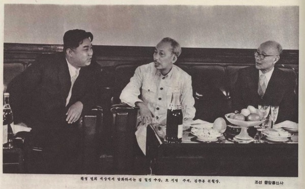 Thủ tướng Kim Nhật Thành (bên trái) và Chủ tịch đảng Tân nhân dân Kim Tu Bong (bên phải), tiếp Chủ tịch Hồ Chí Minh thăm hữu nghị chính thức Triều Tiên năm 1957. Cả 3 đàm đạo không cần phiên dịch v́ đều thông thạo Hán ngữ!