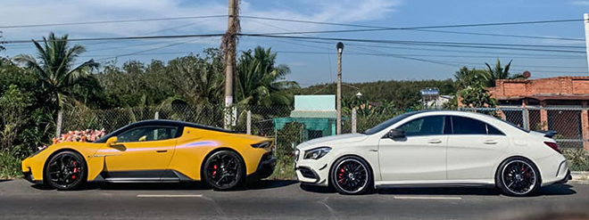 Chiếc Maserati MC20 được trang trí với hoa cưới trên nắp ca-pô phía trước. Trong khi đó, chiếc Mercedes-AMG CLA 45 được trang trí thêm hoa trên tay nắm cửa. Chiếc MC20 này là chiếc đầu tiên được đưa về Việt Nam vào hồi cuối tháng 11/2021 và nhanh chóng được một đại gia tại Tây Ninh “chốt” hàng.