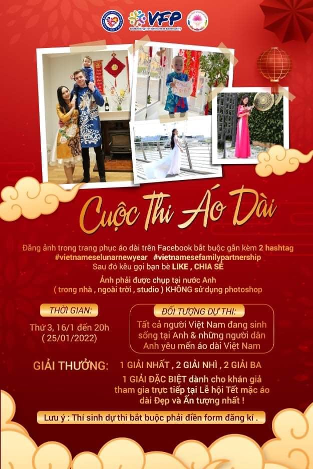 Kính mời bà con cộng đồng Việt tại Anh đăng ký dự thi. Giải thưởng sẽ được thông báo và trao tặng tại Lễ hội Xuân Nhâm Dần ngày 30/1/2022, 12h-4h chiều, Deptford Lounge. Ban tổ chức sẽ không bình chọn cho những thí sinh không đăng ký dự thi trong thời gian trên.