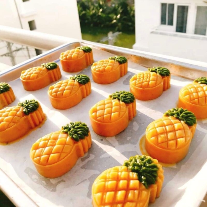 Nếu như kẹo Nougat có nhiều màu sắc thì bánh dứa Đài Loan lại khiến thực khách mê mẩn bởi màu vàng óng ả, hình dáng những trái dứa đáng yêu, xinh xắn rất thích hợp để làm quà chúc mừng năm mới.