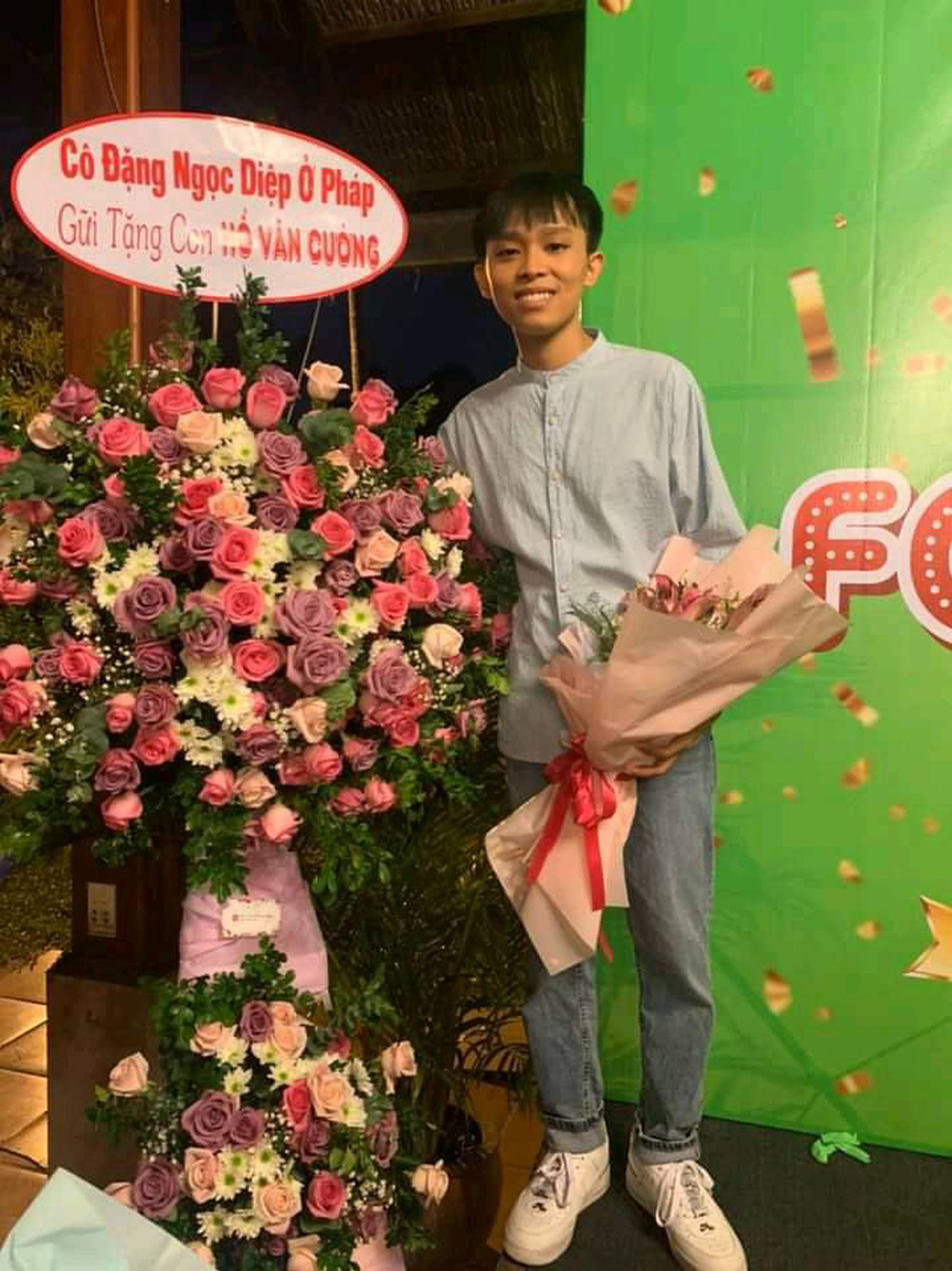 Bữa tiệc được tổ chức ấm cúng, các fan của Hồ Văn Cường đều diện trang phục màu xanh lá có đính kèm hình ảnh thần tượng. Xung quanh là hoa được người hâm mộ từ mọi miền tổ quốc gửi về chúc mừng giọng ca Gò Công.