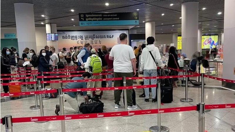 Xếp hàng chờ làm thủ tục tại sân bay ở Campuchia tháng 01/2022