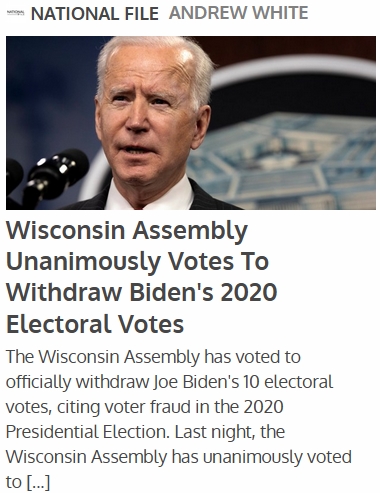 The claim appeared in an article (archived here) published by National File on January 26, 2022. Titled "Wisconsin Assembly Unanimously Votes To Withdraw Biden's 2020 Electoral Votes," the article opened: