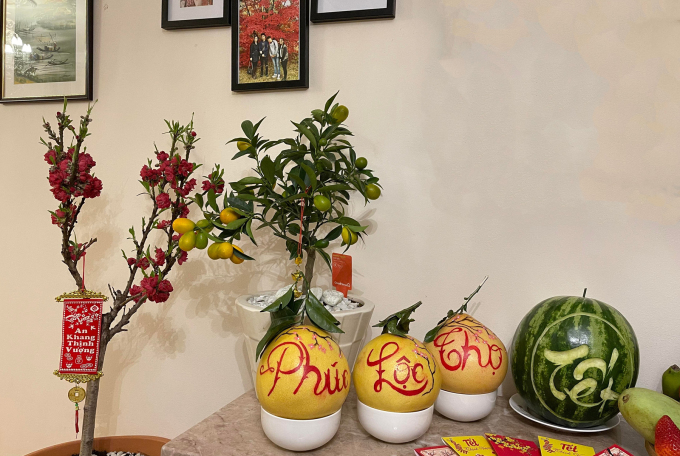 Đào, quất đón xuân của gia đình anh Vinh Lê. Các con anh tự tay khắc, viết chữ lên quả chưng Tết. Ảnh nhân vật cung cấp