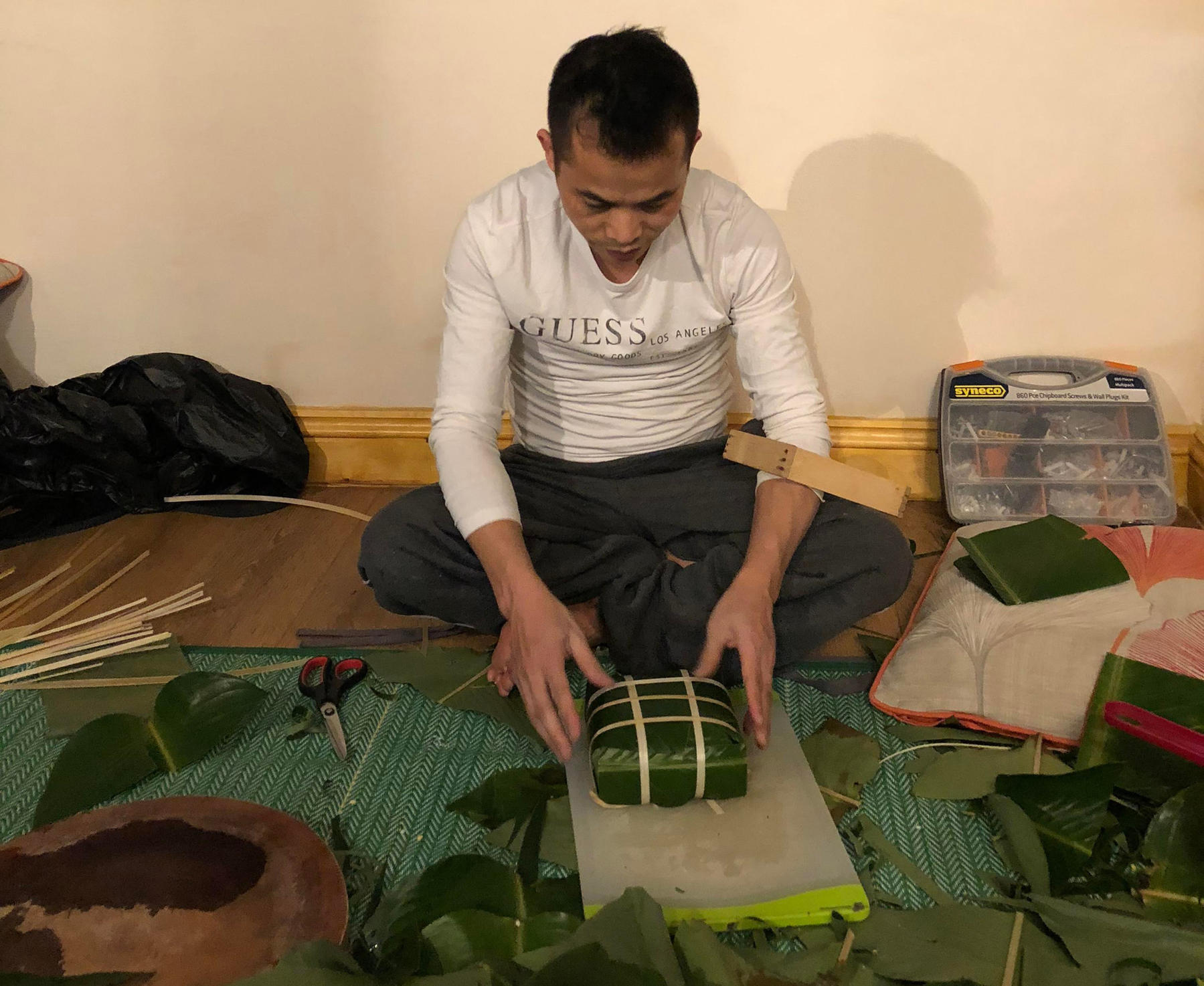 Năm nay anh gói 30 cái bánh chưng, 20 cái giò lụa vừa biếu bạn bè người Việt ở Anh, vừa làm cỗ cho gia đình.