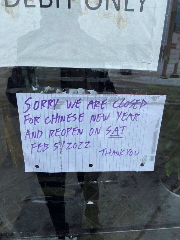Chỉ là hôm nay qua ăn, trên map vẫn đề mở cửa nhưng tới nơi thì đóng. Ok quay về thôi. Ra đến xe thấy có gì là lạ ngờ ngợ liền quay lại đọc kỹ cái bảng “chinese new year”.