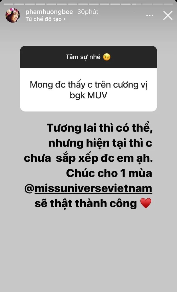 Phạm Hương hứa hẹn sẽ làm giám khảo Hoa hậu Hoàn vũ Việt Nam vào tương lai chứ mùa giải năm nay không thể sắp xếp được.