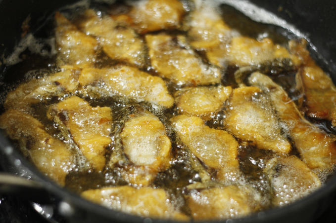Chờ vài phút và thử bằng cách dùng đầu đũa cho vào, thấy sủi tăm là đạt độ nóng. Khi đó, mới cho phi lê cá và chiên. Trong suốt quá tŕnh chiên, luôn giữ nhiệt độ ổn định, tránh thêm dầu vào giữa chừng, bởi sẽ làm giảm nhiệt độ sôi, ảnh hưởng tới độ gịn của cá.