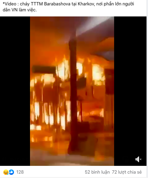 Bom đạn, pháo kích ập xuống khiến chợ Barabasova – trung tâm thương mại lớn nhất của Kharkiv bùng cháy dữ dội. Nơi đây có nhiều cửa hàng, quầy sạp của người Việt buôn bán.