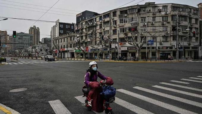 Một phụ nữ lái xe máy trên đường phố vắng vẻ ở Thượng Hải hôm 28/3. Ảnh: AFP