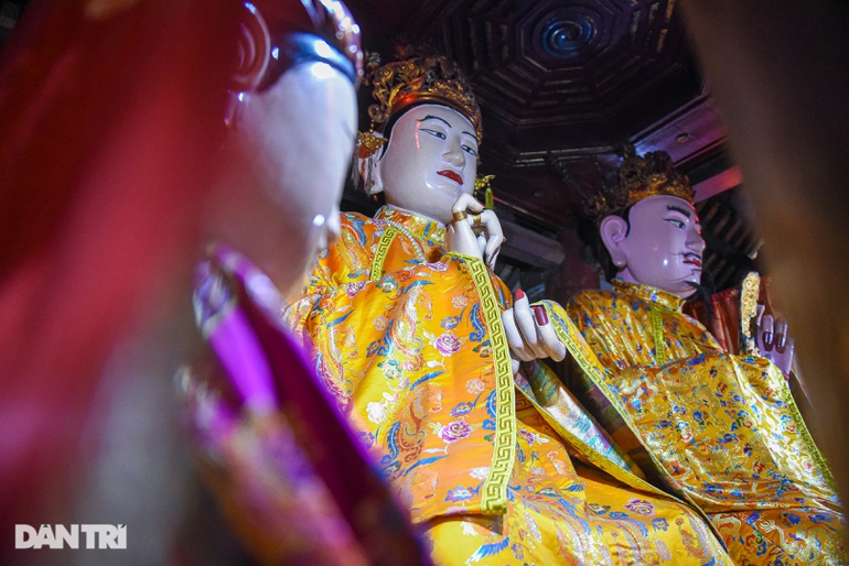 Hai bên là 6 người con của Đức Thánh, còn gọi là Lục vị vương và 2 nàng hầu. "Phần gỗ dùng để tạc tượng Đức Ông, Đức Bà là gỗ trôi trên sông Hồng, mắc lại ở ngay trước cửa đình. Người dân 3 làng sau đó hò nhau vớt lên tạc tượng. Nơi đây rất linh thiêng nên ngày xưa, đình còn nghiêm cấm phụ nữ không được vào cung cấm, chỉ các cụ trong ban khánh tiết mới được vào làm lễ", ông Thìn cho biết.