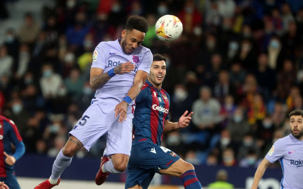 Aubameyang đánh đầu gỡ 1-1 cho Barca ở phút 59. Đây là bàn thứ 10 anh ghi qua 14 trận khoác áo Barca sau khi gia nhập hồi cuối tháng 1. Ảnh: fcbarcelona.com