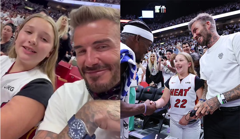 Trên Instagram, cựu danh thủ bóng đá 47 tuổi chia sẻ nhiều hình ảnh của cô con gái nhỏ đáng yêu chăm chú theo dõi trận đấu bóng rổ và hò reo cổ vũ các cầu thủ. Ngoài Harper, David Beckham còn đưa con trai Cruz đi cùng.