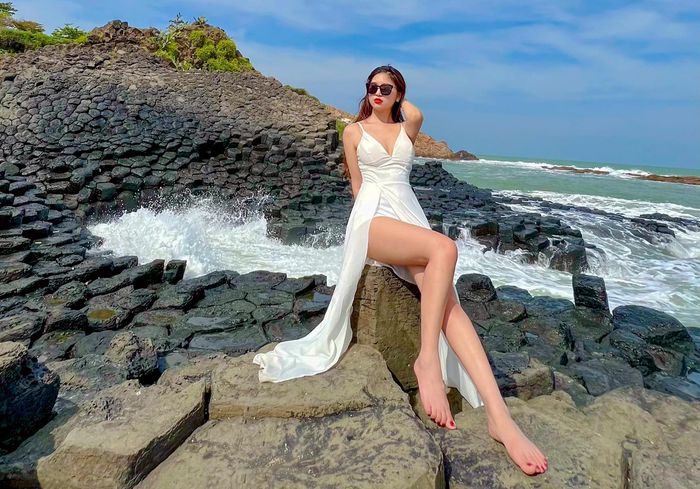 Mỹ Chi (ngụ Hà Nội) check-in bên những phiến đá hình lục giác độc đáo. "Nghe bạn bè giới thiệu nhiều về thắng cảnh Gành Đá Đĩa, lần đầu tiên đến thăm danh thắng này tôi thấy nơi đây rất kỳ diệu", Chi thổ lộ.
