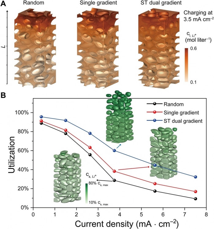 “Trong thiết kế của chúng tôi, chúng tôi kiểm soát toàn bộ mật độ trong tấm điện cực. Chúng tôi sử dụng điện cực có độ xốp cao hơn ở phần trên cùng (của cực dương) nhưng độ xốp thấp hơn ở phần dưới, để tích tụ điện nhanh hơn”, GS Yao Hongbion, thuộc Đại học Khoa học và Công nghệ Trung Quốc cho biết.