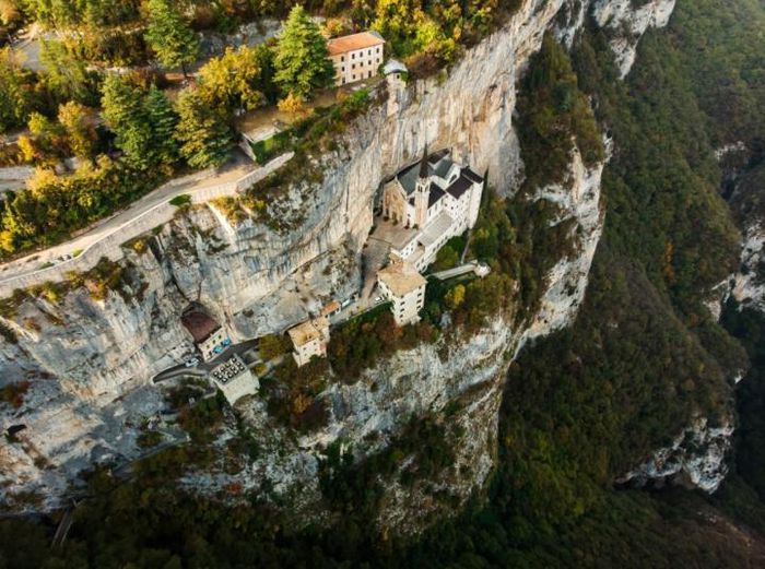 Được xây dựng ở độ cao hơn 700m so với mực nước biển, nằm trên thành một vách đá thẳng đứng ở núi Baldo của Ý, nhà thờ Santuario Madonna della Corona trông như thể đang treo lơ lửng giữa không trung.