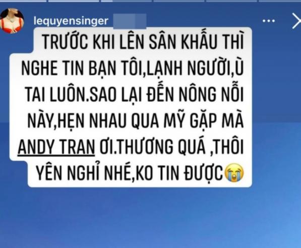 Mới đây trên trang cá nhân của mình, Trizzie Phương Trinh cũng như Lệ Quyên bất ngờ đăng tải tin buồn liên quan đến một người bạn thân. Theo đó trên tường nhà Trizzie Phương Trinh chia sẻ: “Vô cùng đau xót và bàng hoàng khi nghe tin. Mình không tin là bạn mình đã rời thế giới này ra đi nên gọi vào số phone của Andy Tran để kiểm chứng. Khi đầu bên kia bắt lên mình mừng quá, tưởng là Andy. Nhưng không, cũng là một giọng quen thuộc nhưng không phải là của Andy mà là của Hong Dang. Xin đau buồn báo tin tới tất cả bạn bè gần xa của Andy. Mong bạn mình ra đi thanh thản”.