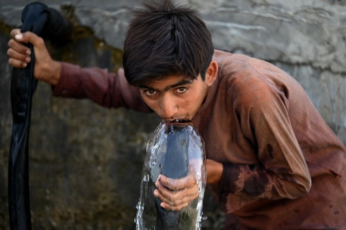 Một cậu bé hứng nước uống từ đường ống nhà máy cấp nước trong đợt nắng nóng ở Jacobabad hôm 11/5. Ảnh: AFP