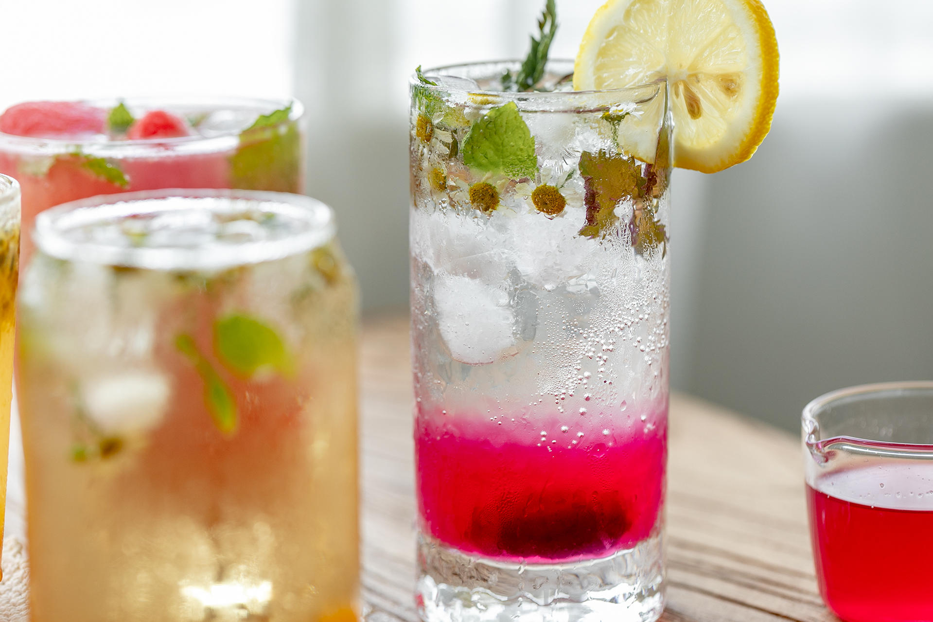 Thêm đá viên hoa cúc bạc hà vào, đổ 30ml siro tía tô lên. Thêm 200ml nước soda vào là xong.