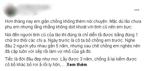 Hơn tháng nay em giận chồng không thèm nói chuyện. Mặc dù lão chưa phụ em nhưng lằng nhằng không dứt khoát với tình cũ nên em bực.