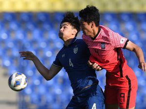 Những phút cuối, hàng thủ Hàn Quốc bất ngờ mắc sai sót. Cơ hội đối mặt mở ra với Achitpol Keereerom, nhưng cầu thủ này không thể thắng thủ môn Go Dong-min.