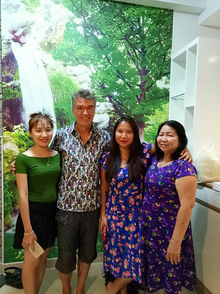 Iola cùng với cha nuôi, mẹ đẻ và em gái song sinh trong chuyến cô về thăm gia đình tại Việt Nam, năm 2018. Ảnh: Nhân vật cung cấp