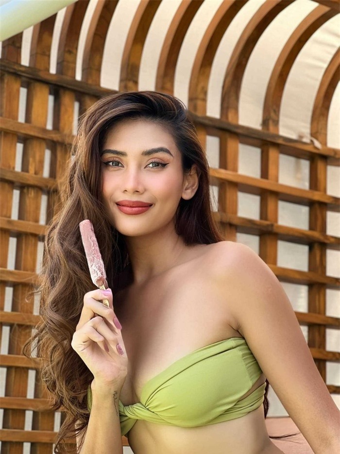 Diện bộ bikini màu xanh oliu, Á hậu Hoàn vũ 2008 khoe trọn vóc dáng nuột nà và gợi cảm. Thiết kế bikini 2 mảnh gam màu xanh làm nổi bật làn da rám nắng khỏe khoắn của Võ Hoàng Yến. Ở tuổi 34, siêu mẫu Võ Hoàng Yến vẫn khiến fans trầm trồ khi giữ được vóc dáng săn chắc, gợi cảm như thời kỳ còn đỉnh cao.