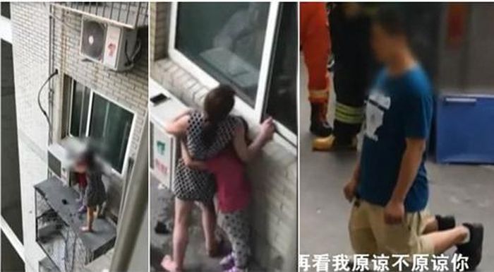 Sự việc diễn ra tại một khu chung cư ở Bắc Kinh, Trung Quốc. Một cô vợ trèo ra ngoài cửa sổ, ôm đứa con gái nhỏ định nhảy xuống dưới khiến hàng xóm tá hỏa.
